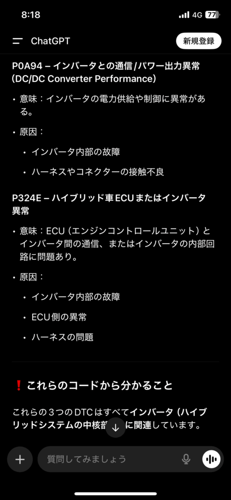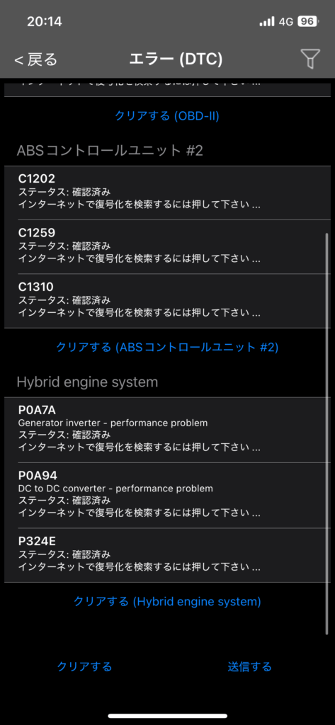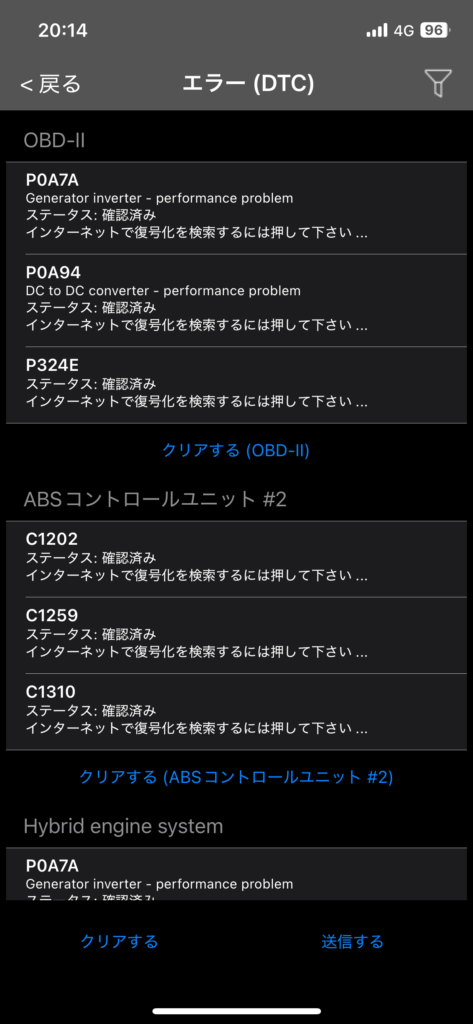 ふむふむ、「バッテリーの異常だね」とこの診断結果を見ても勘違いしてた、inverter converterなどと書いてあるのに。今これを見てバッテリーなんて言葉がどこにもないのは明らかだ、予兆から駆動用バッテリーだと完全に思い込んでしまっていた、言い訳をするならば「だって初めて見たし、経験したことないし」だ