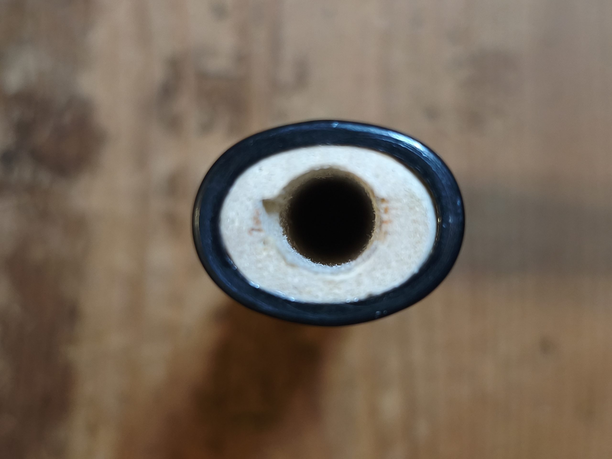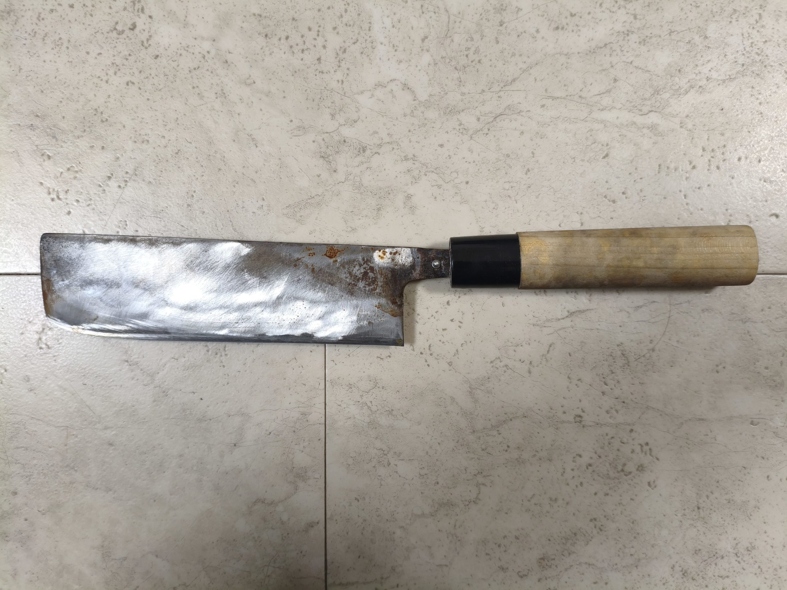 写真では既に欠けはグラインダーで5mm程度削っちゃいました。刃面が水平でないので分かると思いますが、柄の方から2,3cmのところが欠けてたところです。刃面をまた水平になるように削りましょうかね。