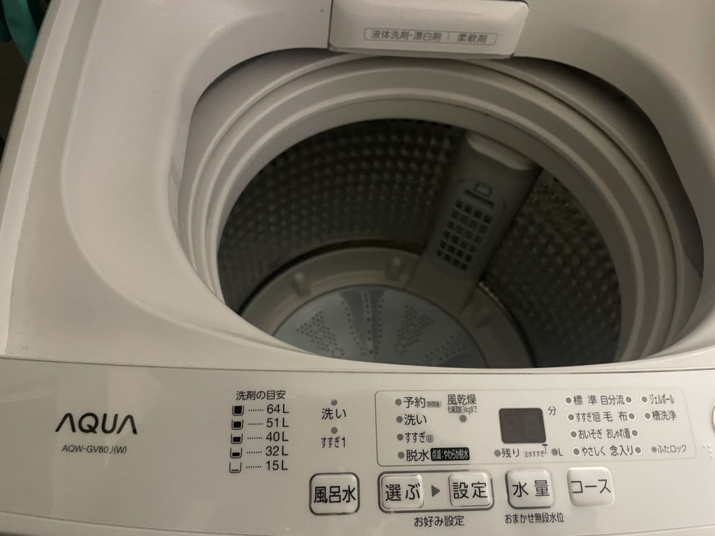 洗濯機はこちらのAQUAの2020年製 AQW-GV80J(W)、普通の縦型8kg洗濯機です。およそ購入後4年経過でほぼ毎日1回以上は稼働しています。カビ臭さが目立ってきたので今回分解清掃を行いました。