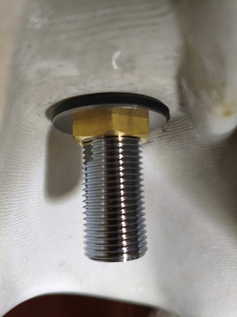 全ネジ突出量47mmです。水栓の元の長さが58mmなので洗面台厚み+ゴムパッキンが挟まって約11mmですね。
